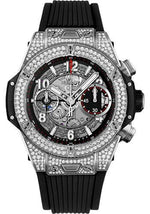 42 mm satin-finished and polished titanium case set with 170 diamonds for ~0.8ct, satin-finished and polished titanium bezel set with 126 diamonds for ~1.1cts, 6 H-shaped titanium screws, sapphire crystal with anti-reflective treatment, matte black skeleton dial, HUB1280 UNICO manufacture self-winding chronograph flyback movement, approximately 72 hours of power reserve, black structured lined rubber strap, titanium deployant buckle. Water resistant to 100m (10 ATM).