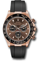 40mm 18K Everose gold case, screw-down Everose back, screw-down crown and push buttons with Triplock triple waterproofness, black monobloc Cerachrom bezel with engraved tachymetric scale, scratch-resistant double anti-reflective sapphire crystal, chocolate dial, index hour markers, Rolex calibre 4130 perpetual self-winding movement with chronograph central second hand, 30-minute counter at 3 o'clock, and 12-hour counter at 9 o'clock, approximately 72 hours of power reserve, black Oysterflex strap made from flexible metal blades overmoulded with high-performance elastomer, Oysterlock folding safety buckle with Easylink 5mm rapid extension system. Waterproof to 100 meters.