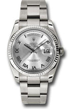 36mm 18K white gold case, fluted bezel, rhodium dial, Roman numerals, and Oyster bracelet.