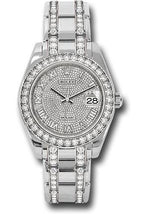 39mm 18K white gold case, screw-down back, screw-down crown with twinlock double waterproofness system, bezel set with 36 diamonds, scratch-resistant sapphire crystal with cyclops lens over the date, diamond paved dial, Roman numerals, Rolex calibre 3235 automatic movement with center hour, minute and seconds hands, instantaneous date at 3 o'clock with rapid setting, and stop-seconds for precise time setting, approximately 70 hours of power reserve, Pearlmaster bracelet with rounded five-piece links set with 144 diamonds, concealed folding Crownclasp buckle. Waterproof to 100 meters.