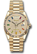 Rolex Yellow Gold Day-Date 36 Watch - Fluted Bezel - Diamond-Paved Rainbow Sapphire Dial - President Bracelet - 128238 dprsp
