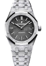 37 mm hammered 18K white gold case, 9.8 mm thick, sapphire crystal back, screw-locked crown, black dial with Grande Tapisserie pattern, white gold applied hour-markers and Royal Oak hands with luminescent coating, Manufacture Calibre 3120 selfwinding movement with hours, minutes, centre seconds and date, approximately 60 hours of power reserve, hammered 18K white gold bracelet, AP folding buckle. Water resistant to 50 m.