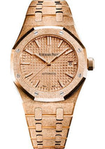 37 mm hammered 18K pink gold case, 9.8 mm thick, sapphire crystal back, screw-locked crown, pink gold-toned dial with Grande Tapisserie pattern, pink gold applied hour-markers and Royal Oak hands with luminescent coating, Manufacture Calibre 3120 selfwinding movement with hours, minutes, centre seconds and date, approximately 60 hours of power reserve, hammered 18K pink gold bracelet, AP folding buckle. Water resistant to 50 m.