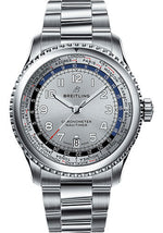 43.00 mm steel case, 14.55 mm thick, sapphire crystal back, screw-locked crown with two gaskets, bidirectional bezel, cambered sapphire crystal with glareproof treatment on both sides, mercury silver dial, Breitling B35 selfwinding movement with world time function and date in dial aperture, approximately 70 hours of power reserve, steel Professional III bracelet. Water resistant to 100 m (330 ft).
