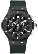 44mm black ceramic case, black ceramic bezel, black composite resin lateral inserts and bezel lugs, carbon dial, self winding HUB 4100 movement with chronograph function, approximately 42 hours of power reserve, black rubber strap with deployant buckle. Water resistant to 100 meters.