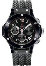 41mm black ceramic case, black ceramic bezel, black dial, self winding HUB 41 movement with chronograph function, approximately 42 hours of power reserve, black rubber strap with deployant buckle. Water resistant to 100 meters.