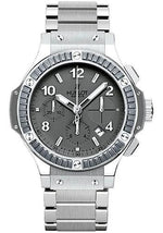 41mm stainless steel case, 18K white gold bezel set with 48 hematite baguettes, gray composite resin lateral inserts and bezel lugs, tantulum color dial, self winding HUB 1145 movement with chronograph function, approximately 42 hours of power reserve, stainless steel bracelet. Water resistant to 100 meters.