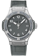 38mm stainless steel case, stainless steel bezel set with 48 hematite baguettes, gray composite resin lateral inserts and bezel lugs, tantulum color dial, quartz HUB 2900 movement, gray rubber and gummy alligator strap with deployant buckle. Water resistant to 100 meters.