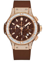 44mm 18K red gold case set with 212 diamonds (1.08 ct), 18K red gold bezel set with 48 baguette diamonds (2.80 ct), chocolate composite resin lateral inserts and bezel lugs, chocolate dial, self winding HUB 4100 movement with chronograph function, approximately 42 hours of power reserve, chocolate rubber strap with deployant buckle. Water resistant to 100 meters.