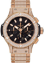 44mm 18K red gold case set with 212 diamonds (1.08 ct), 18K red gold bezel set with 114 diamonds (1.78 ct), black composite resin lateral inserts and bezel lugs, mat black dial, self winding HUB 4100 movement with chronograph function, approximately 42 hours of power reserve, 18K red gold bracelet with central links paved with 576 diamonds (7.41ct). Water resistant to 100 meters.