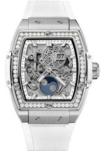 42 mm satin-finished and polished titanium case, polished titanium bezel set with 48 diamonds for 0.58ct and 6 H-shaped titanium screws, sapphire crystal with anti-reflective treatment, sapphire dial, HUB 1770 self-winding skeleton movement with big date moonphase, approximately 50 hours of power reserve, white structured lined rubber strap, stainless steel deployant buckle. Water resistant to 100 meters.