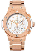 44mm 18K red gold case, 18K red gold bezel, white composite resin lateral inserts and bezel lugs, white dial, self winding HUB 4100 movement with chronograph function, approximately 42 hours of power reserve, 18K red gold bracelet. Water resistant to 100 meters.