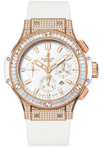 44mm 18K red gold case set with 48 baguette diamonds (2.80 ct), 18K red gold bezel set with 114 diamonds (1.78 ct), white composite resin lateral inserts and bezel lugs, white dial, self winding HUB 4100 movement with chronograph function, approximately 42 hours of power reserve, white rubber strap with deployant buckle. Water resistant to 100 meters.