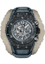 45 mm frosted carbon fiber case, frosted carbon fiber bezel with 6 H-shaped titanium screws, sapphire crystal with anti-reflective treatment, mat ice blue skeleton dial with mountain applique in counter, HUB1242 self-winding movement with chronograph flyback and column wheel, approximately 72 hours of power reserve, black rubber and ice blue sheepskin cuff strap with sheep wool, comes with additional black rubber and vintage ice blue calf strap, titanium deployant buckle. Water resistant to 100 meters.