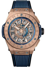 45 mm satin-finished and polished 18K King gold case, satin-finished and polished 18K King gold bezel with engraved dual time and 6 H-shaped titanium screws blue composite resin lower bezel, sapphire crystal with anti-reflective treatment, blue and gold-plated skeleton dial, HUB1251 self-winding movement with GMT, approximately 72 hours of power reserve, black and blue structured lined rubber strap, 18K King gold and black-plated titanium deployant buckle. Water resistant to 100 meters.