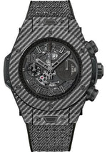 45 mm carbon fiber and grey Texalium case, carbon fiber and grey Texalium bezel with 6 H-shaped black PVD titanium screws, sapphire crystal with anti-reflective treatment and Hublot logo printed on the inner side, mat black dial with black-plated counters, satin-finished and microblasted black-plated appliques and hands, and black luminescent on hour markers and hands, HUB1242 UNICO manufacture self-winding chronograph flyback movement with column wheel, approximately 72 hours of power reserve, black rubber and genuine grey jeans strap with black studs, carbon fiber deployant buckle with carbon insert. Water resistant to 100 meters.
