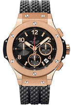 44mm 18k red gold case, 18K red gold bezel, black dial, self winding HUB 44 movement with chronograph function, approximately 42 hours of power reserve, black rubber strap with deployant buckle. Water resistant to 100 meters.