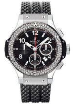 44mm stainless steel case, stainless steel bezel set with 114 diamonds, black dial, self winding HUB 44 movement with chronograph function, approximately 42 hours of power reserve, black rubber strap with deployant buckle. Water resistant to 100 meters.