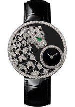 36 mm rhodiumized 18K white gold case set with 234 brilliant-cut diamonds, 8.8 mm thick, black lacquer dial with rhodiumized white gold panther motif set with 225 brilliant-cut diamonds totaling 0.58 carats, quartz movement, shiny black alligator leather strap, rhodiumized 18K white gold ardillon buckle. Water resistant to 3 bar (approx 30 meters/100 feet).