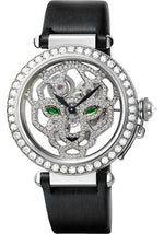 42mm 18K white gold case set with round diamonds, 9.4mm thick, sapphire back, diamond set crown, sapphire crystal, 18K white gold dial with a panther-head motif created by the bridges of the movement, bridges in 18K white gold set with round diamonds, 2 tsavorite garnet eyes, onyx nose and diamond-shaped black oxidized-steel hands, caliber 9613 MC manual movement, black fabric strap, deployant buckle with 18K white gold set with diamonds. Water resistant to 30 meters.