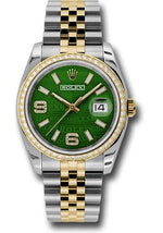 Rolex Steel and Yellow Gold Rolesor Datejust 36 Watch - 52 Brilliant-Cut Diamond Bezel - Green Wave Diamond Arabic 6 And 9 Dial - Jubilee Bracelet - 116243 gwdaj