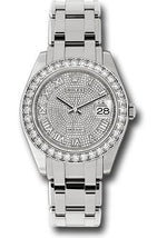 39mm 18K white gold case, screw-down back, screw-down crown with twinlock double waterproofness system, bezel set with 36 diamonds, scratch-resistant sapphire crystal with cyclops lens over the date, diamond paved dial, Roman numerals, Rolex calibre 3235 automatic movement, Datejust Pearlmaster bracelet with rounded five-piece links, concealed folding Crownclasp buckle. Waterproof to 100 meters.