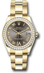 31mm 18K yellow gold case, screw-down crown with twinlock double waterproofness system, bezel set with 46 diamonds, scratch-resistant sapphire crystal with cyclops lens over the date, dark grey diamond Roman IV dial, Roman numerals with 11 diamonds set on VI, Rolex calibre 2236 automatic movement with center hour, minute and seconds hands, instantaneous date with rapid setting, and stop-seconds for precise time setting, approximately 55 hours of power reserve, 18K yellow gold Oyster bracelet with flat three-piece links, concealed folding Crownclasp buckle. Waterproof to 100 meters.