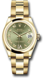 31mm 18K yellow gold case, screw-down crown with twinlock double waterproofness system, domed bezel, scratch-resistant sapphire crystal with cyclops lens over the date, olive green diamond Roman IV dial, Roman numerals with 11 diamonds set on VI, Rolex calibre 2236 automatic movement with center hour, minute and seconds hands, instantaneous date with rapid setting, and stop-seconds for precise time setting, approximately 55 hours of power reserve, 18K yellow gold Oyster bracelet with flat three-piece links, concealed folding Crownclasp buckle. Waterproof to 100 meters.