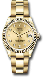 31mm 18K yellow gold case, screw-down crown with twinlock double waterproofness system, fluted bezel, scratch-resistant sapphire crystal with cyclops lens over the date, champagne dial, 10 diamond hour markers, Rolex calibre 2236 automatic movement with center hour, minute and seconds hands, instantaneous date with rapid setting, and stop-seconds for precise time setting, approximately 55 hours of power reserve, 18K yellow gold Oyster bracelet with flat three-piece links, concealed folding Crownclasp buckle. Waterproof to 100 meters.