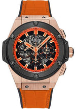48mm 18K rose gold case sapphire crystal back,, black ceramic and black rubber bezel with 6 H-shaped black screws, black composite resin bezel lugs, sapphire crystal with anti-reflective treatment, skeleton dial with black and orrange flange, self winding HUB 4214 movement with chronograph function, approximately 42 hours of power reserve, black rubber and orange alligator strap with orange stitching, deployant buckle. Water resistant to 100 meters.