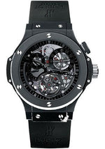 44mm black mat ceramic case, black mat ceramic bezel, skeleton black dial, manual winding tourbillon HUB 1400CT movement with chronograph function, black rubber strap with deployant buckle. Water resistant to 100 meters.