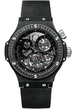 44mm black mat ceramic case, 18K white gold PVD bezel set with 48 black baguette diamonds, skeleton black dial, manual winding tourbillon HUB 1400CT movement with chronograph function, black rubber strap with deployant buckle. Water resistant to 100 meters.