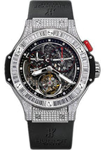 44mm platinum case set with 212 diamonds, platinum bezel set with 48 baguette diamonds, skeleton black dial, manual winding tourbillon HUB 1400CT movement with chronograph function, black rubber strap with deployant buckle. Water resistant to 100 meters.