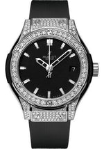 33mm titanium case set with 114 diamonds (0.59ct), titanium bezel set with 36 diamonds (0.75ct), black composite resin lateral inserts and bezel lugs, mat black dial, quartz HUB 2912 movement, black rubber strap with deployant buckle. Water resistant to 50 meters.