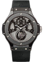 Black ceramic case, black ceramic bezel, black dial, manual winding tourbillon HUB Solo T movement, black rubber strap with deployant buckle. Water resistant to 100 meters.