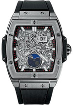 42 mm polished and satin-finished titanium case, polished and satin-finished microblasted titanium bezel, sapphire crystal with anti-reflective treatment, sapphire dial, HUB 1770 self-winding skeleton movement with big date and moonphase, approximately 50 hours of power reserve, black rubber strap, stainless steel deployant buckle. Water resistant to 100 m.
