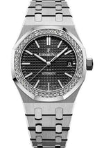 37 mm stainless steel case, 9.8 mm thick, glareproofed sapphire crystal back, screw-locked crown, diamond-set bezel, glareproofed sapphire crystal, black dial with Grande Tapisserie pattern, white gold applied hour-markers and Royal Oak hands with luminescent coating, Calibre 3120 selfwinding movement with dive-time measurement, hours, minutes, center seconds and date, approximately 60 hours of power reserve, stainless steel bracelet, AP folding buckle. Water resistant to 50 meters.