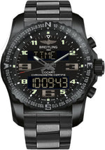46.00 mm black titanium case, solid back with screws, non screw-locked crown with two gaskets and integrated push piece, bidirectional ratcheted rotating bezel windrose, cambered sapphire crystal with glareproof treatment on both sides, Volcano black dial, thermocompensated SuperQuartz electronic Breitling B50 movement with rechargeable battery, chronograph function, countcown countup clock, flight time chronograph, electronic tachometer, countdown, 2nd timezone, alarms, analog and 12/24 hr LCD digital display, backlighting, and EOL indicator, black titanium Professional III bracelet. Water resistant to 100 m (330 ft).