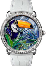 42mm 18K white gold case set with 60 brilliant-cut diamonds, 8.5mm thick, beaded crown with a brilliant-cut diamond , 18K white gold bezel set with 60 brilliant-cut diamonds, sapphire crystal, blue dial with plique-to-day enamel and paint on mother of pearl, caliber 430 MC manual-winding movement, white alligator skin strap, 18K white gold buckle set with 43 brilliant-cut diamonds (0.42K). Water resistant to 30 meters.