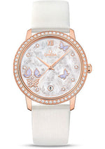 36.8 mm 18K red gold case, diamond bezel, domed scratch-resistant sapphire crystal with anti-reflective treatment inside, white mother-of-pearl dial with decorative butterfly design and nine diamond indexes in 18K yellow gold holders, self-winding chronometer Omega 2500 movement with Co-Axial Escapement, approximately 48 hours of power reserve, white leather strap. Water resistant to 100 m.