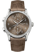 35 mm 18K white gold case set with 112 diamonds (~ 0.59 ct), sapphire-crystal back, brown sunburst dial with gold applied numerals, caliber 215 PS FUS 24H manually wound movement with Calatrava Travel Time (dual time zone mechanism indicating local and home time, indication of 24-hour home time and seconds subdial), approximately 44 hours of power reserve, shiny taupe alligator strap with square scales. Water resistant to 30 m.