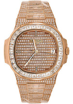40 mm rose gold case set with 100 diamonds (~0.69 ct) and 32 baguette diamonds (~5.51 ct), rose gold dial fully set with 255 diamonds (~1.36 ct) and 3 baguette diamond hour markers (~0.01 ct), caliber 324 S C self-winding movement with date and center sweep second hand, approximately 35-45 hours of power reserve, bracelet set with 150 baguette diamonds and paved with 803 diamonds, Nautilus fold-over buckle. Water resistant to 120 m.
