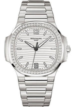 35.2 mm steel case, 8.62 mm thick, sapphire-crystal back, diamond-set bezel, silvery opaline dial with gold applied hour markers and numerals with luminescent coating, caliber 324 S C self-winding movement with date in an aperture, sweep seconds hand, approximately 35-45 hours of power reserve, steel bracelet, nautilus fold-over buckle. Water resistant to 60 m.