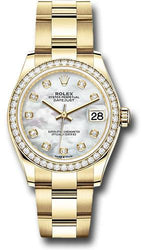 31mm 18K yellow gold case, screw-down crown with twinlock double waterproofness system, bezel set with 46 diamonds, scratch-resistant sapphire crystal with cyclops lens over the date, mother-of-pearl dial, 10 diamond hour markers, Rolex calibre 2236 automatic movement with center hour, minute and seconds hands, instantaneous date with rapid setting, and stop-seconds for precise time setting, approximately 55 hours of power reserve, 18K yellow gold Oyster bracelet with flat three-piece links, concealed folding Crownclasp buckle. Waterproof to 100 meters.