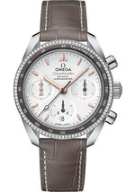Omega Speedmaster 38 Co-Axial Chronograph Watch - 38 mm Steel Case - Dual Diamond Bezel - Silvery Dial - Taupe-Brown Leather Strap - 324.38.38.50.02.001