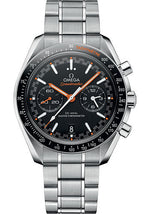 44.25 mm stainless steel case with antimagnetic design, transparent back, black ceramic bezel with tachymeter scale in orange wording and liquidmetal scale, domed scratch-resistant sapphire crystal with anti-reflective treatment on both sides, matt black dial with racing style minute-track, caliber 9900 self-winding Co-Axial master chronometer movement with chronograph and date functions, approximately 60 hours of power reserve, stainless steel bracelet. Water resistant to 50 m (167 ft).