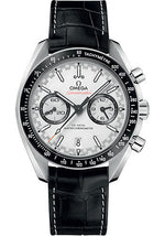 44.25 mm stainless steel case with antimagnetic design, transparent back, black ceramic bezel with tachymeter scale in white enamel, domed scratch-resistant sapphire crystal with anti-reflective treatment on both sides, white dial with racing style minute-track, caliber 9900 self-winding Co-Axial master chronometer movement with chronograph and date functions, approximately 60 hours of power reserve, black leather strap. Water resistant to 50 m (167 ft).