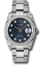 36mm stainless steel case, 18K white gold bezel set with 52 brilliant-cut diamonds, blue Jubilee dial, diamond hour markers, and stainless steel Oyster bracelet.
