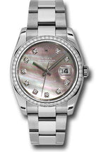 36mm stainless steel case, 18K white gold bezel set with 52 brilliant-cut diamonds, dark mother of pearl dial, diamond hour markers, and stainless steel Oyster bracelet.