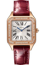 Cartier Santos-Dumont Watch - 38 mm x 27.5 mm Pink Gold Case - Silver Satin-Brushed Dial - Burgundy Leather Strap - WJSA0017